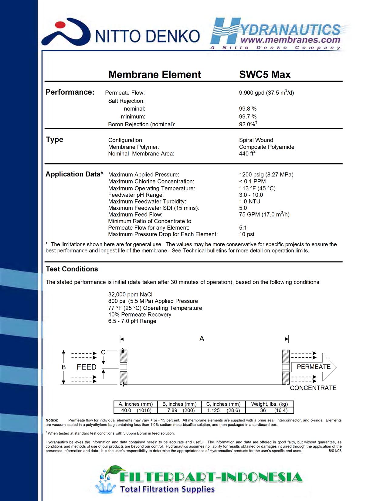 The Hydranautics SWC5 Max membrane is an 8" x 40" high performance membrane for seawater desalting. The SWC5 Max is designed to offer the perfect combination of high flow, and superior salt and boron rejection with low operating pressures.